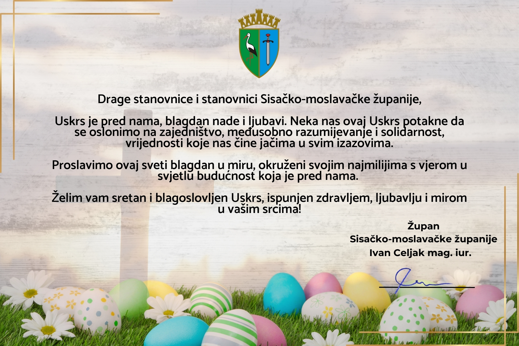 Uoči najradosnijeg blagdana Uskrsa, župan Ivan Celjak uputio je čestitku svim stanovnicama i stanovnicima Sisačko-moslavačke županije.