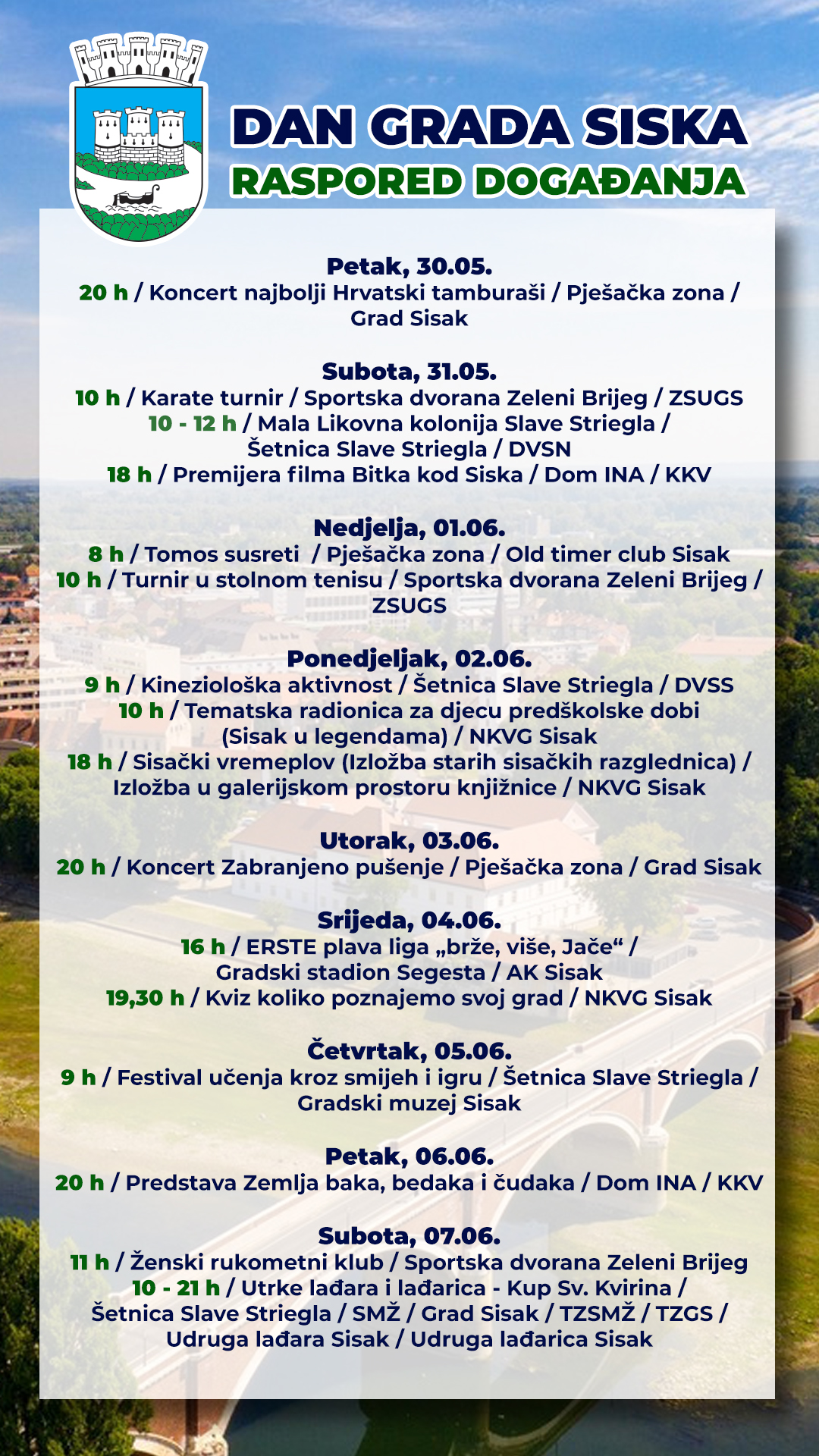 Tako će na Dan državnosti koncert na sisačkom Korzu s početkom u 20 sati održati Najbolji hrvatski tamburaši, a 3. lipnja, na istoj lokaciji, od 20 sati Zabranjeno pušenje.