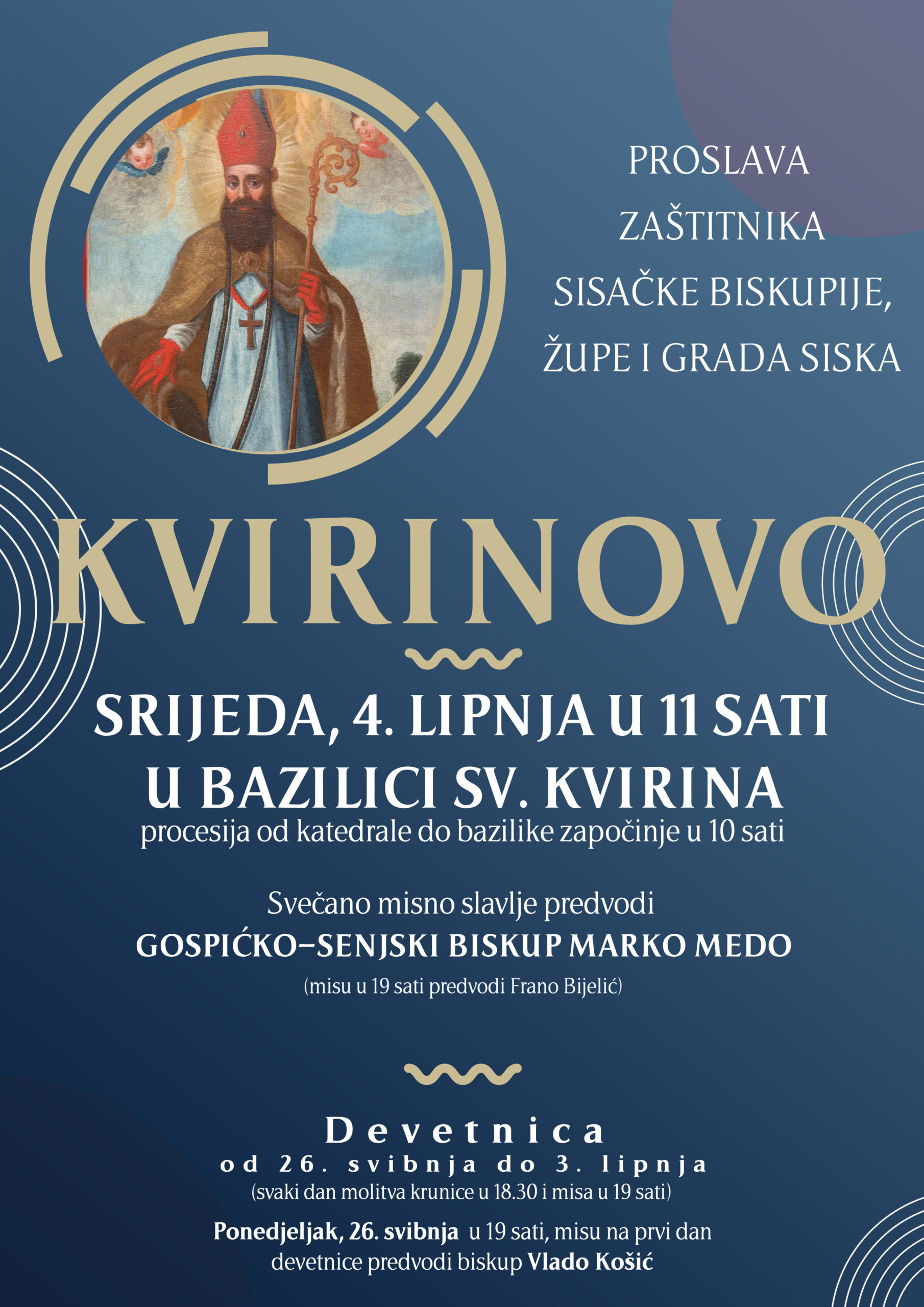 Svetkovina sv. Kvirina, zaštitnika Sisačke biskupije i grada Siska, bit će proslavljena u srijedu, 4. lipnja u Sisku i njemu posvećenoj sisačkoj župi.