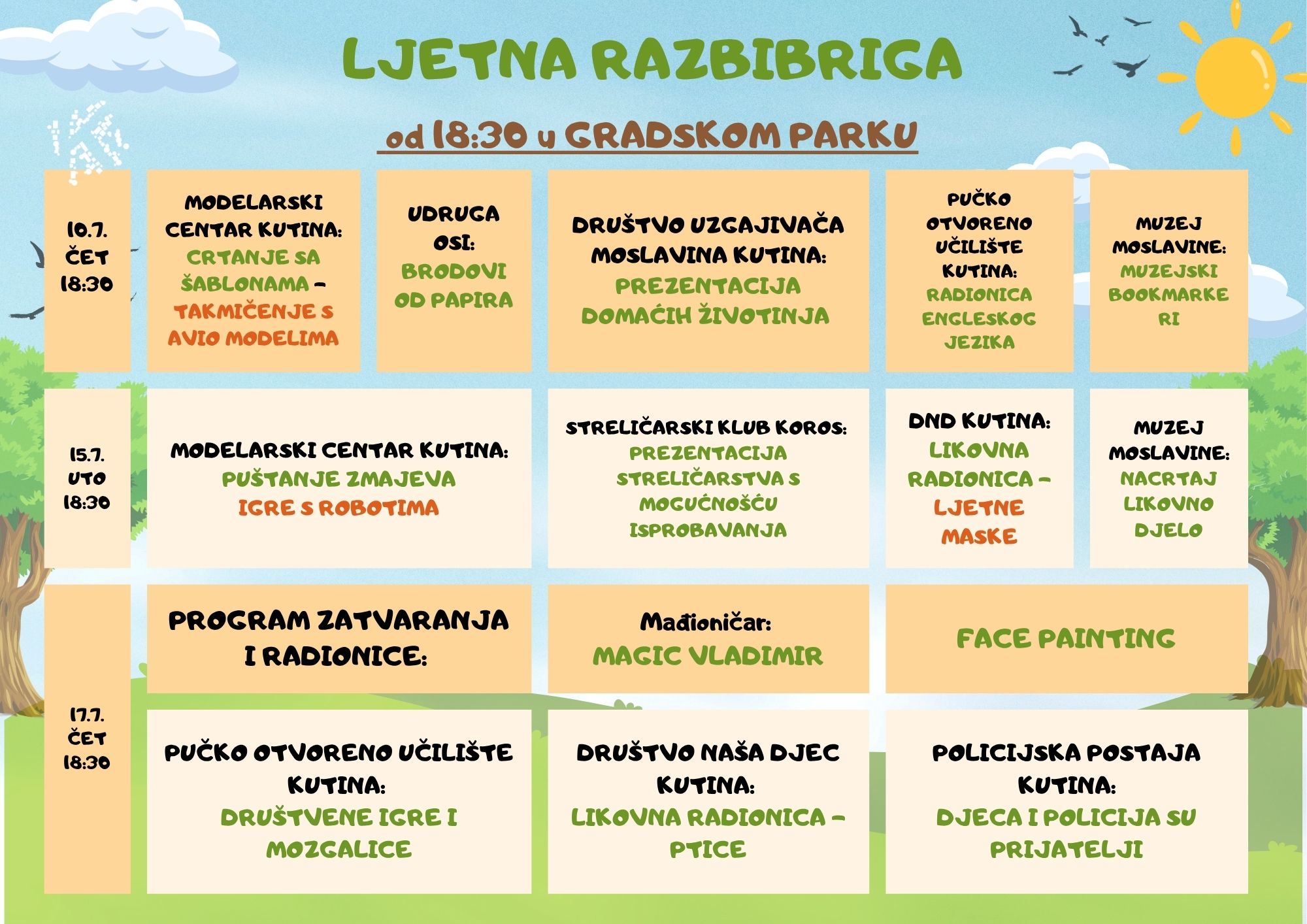 Tijekom srpnja, svakog utorka i četvrtka, gradski park postaje mjesto susreta, igre i otkrivanja novih vještina uz raznovrstan program:
