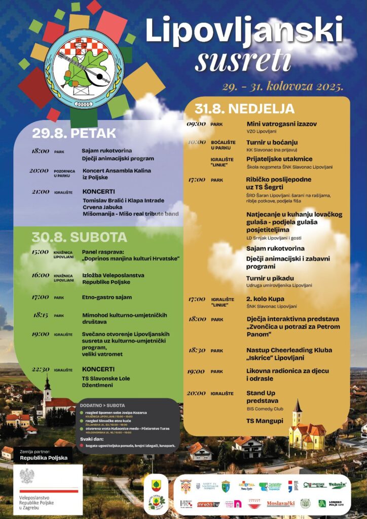 I ove godine kraj mjeseca kolovoza, što se tiče kulturno – zabavnog sadržaja u Sisačko – moslavačkoj županiji, vodi nas u Lipovljane, koji će od 29. do 31. kolovoza biti centar kulturne raznolikosti i dobre zabave za sve uzraste. Dakako, riječ je o “Lipovljanskim susretima” – manifestaciji tijekom koje se svake godine susreću generacije, tradicije različitih narodnosti i pozitivna energija protkana kroz glazbu i ples, ali i bogatu gastronomsku ponudu, kao i brojne radionice, poput onih za najmlađe.