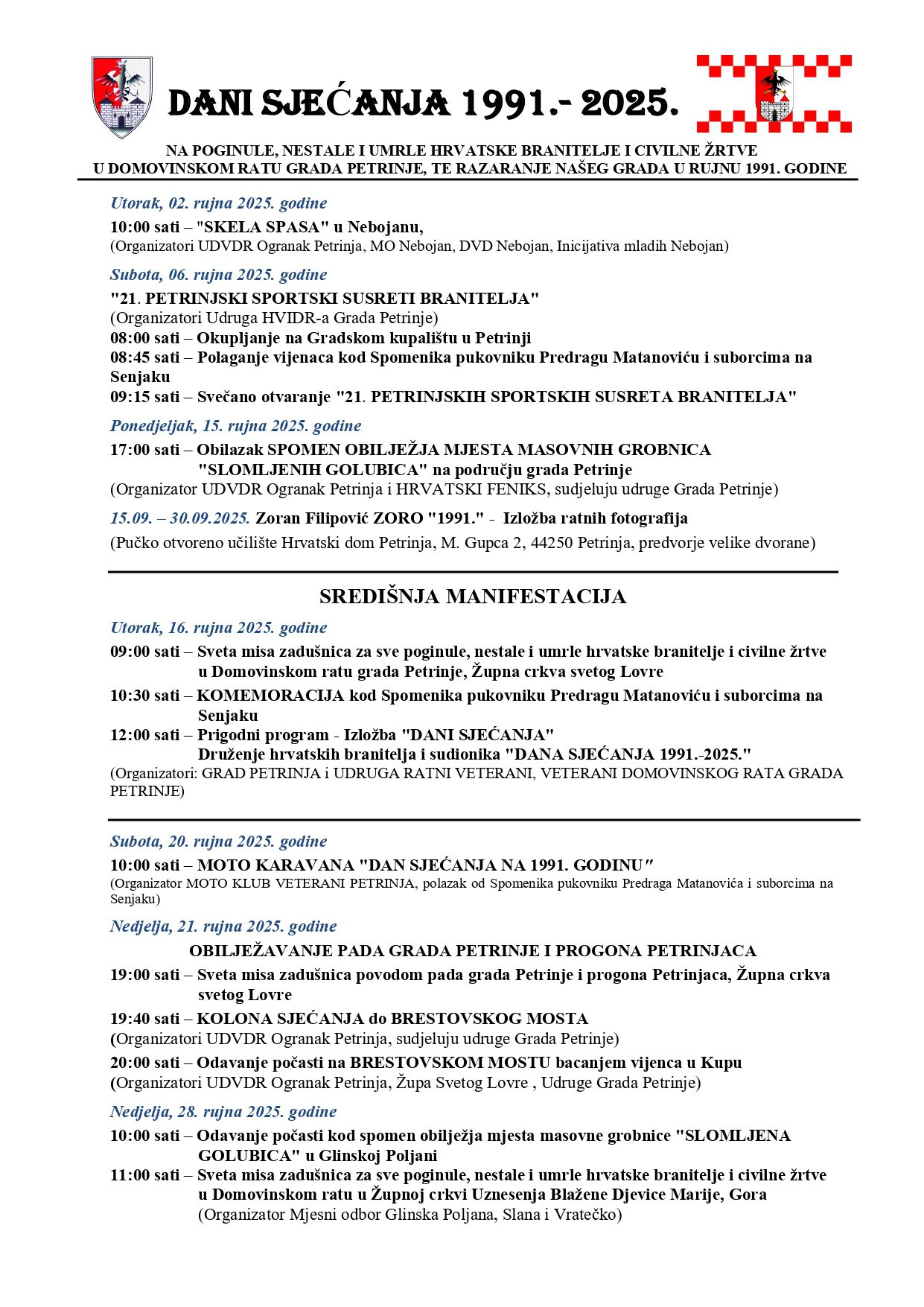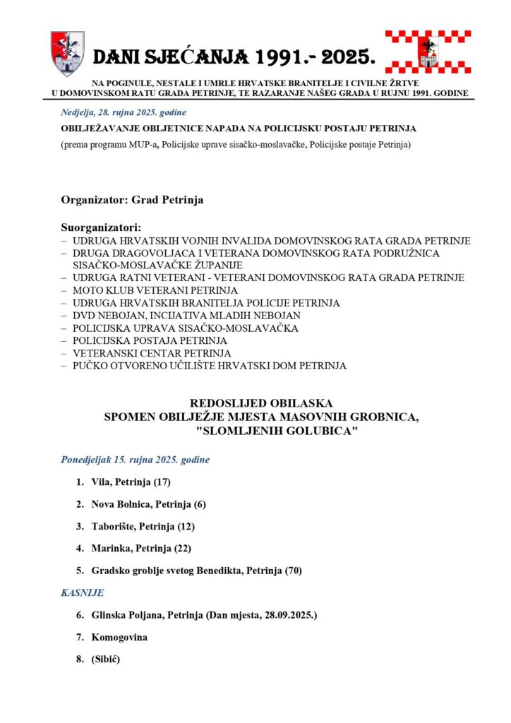 PETRINJA: Program obilježavanja “Dana sjećanja 1991. – 2025.”