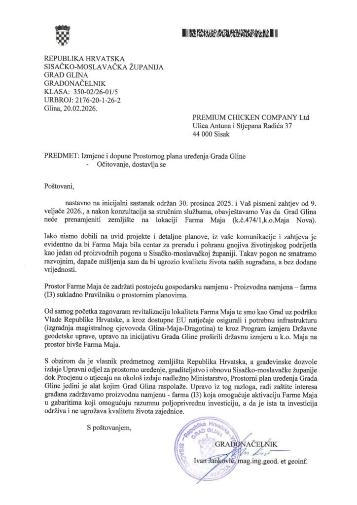 Nakon zaprimanja njihovog zahtjeva, te konzultacija sa stručnim službama, zauzeo sam jasan stav – Grad Glina neće prenamijeniti predmetno zemljište.