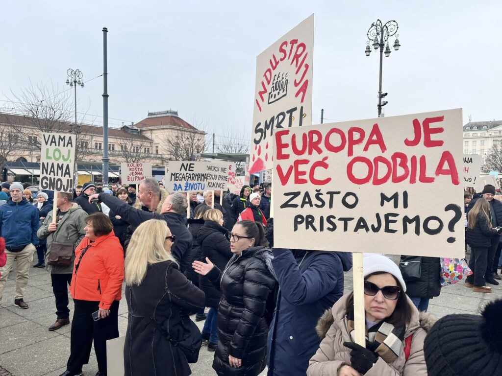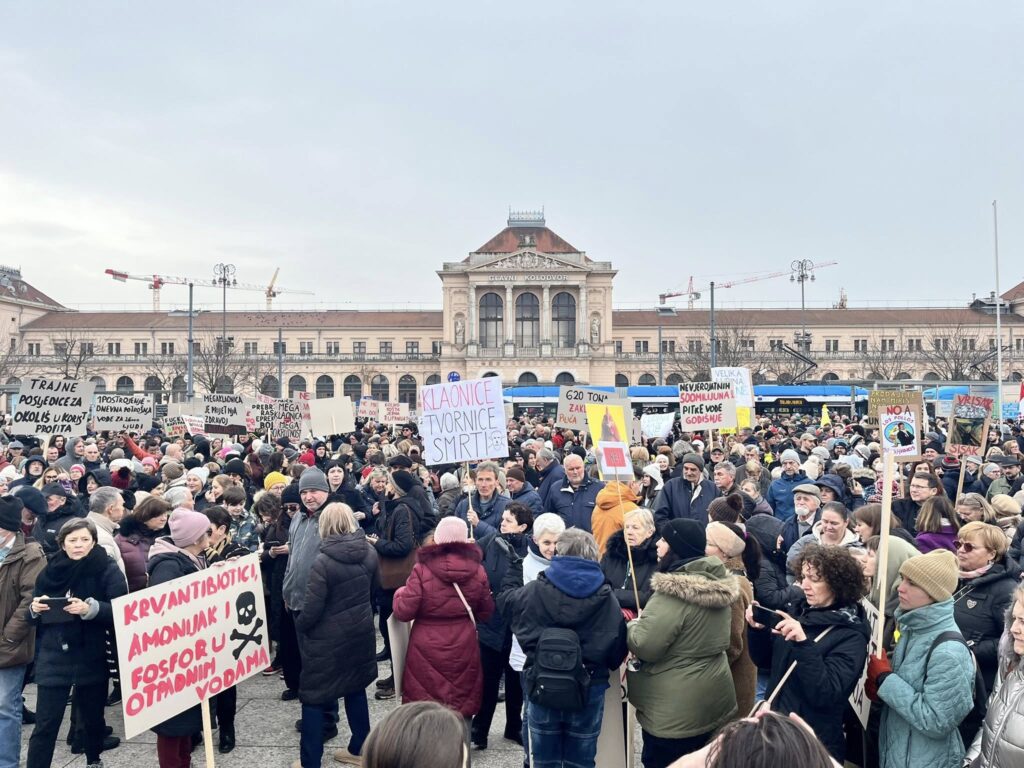 Više tisuća prosvjednika okupilo se u središtu Zagreba na prosvjedu protiv peradarskog kompleksa koji bi trebao biti izgrađen diljem Sisačko – moslavačke županije.