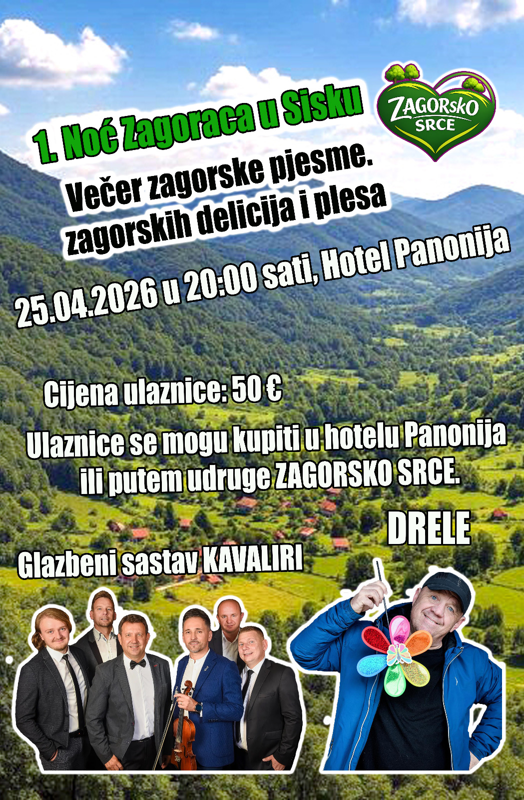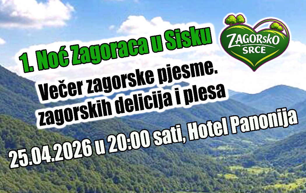 Udruga koja okuplja ljude podrijetlom iz Hrvatskog zagorja na području Sisačko-moslavačke županije “ZAGORskO SRCE” u subotu, 25. travnja organizira 1. Noć Zagoraca u Sisku – Večer zagorske pjesme, zagorskih delicija i plesa.