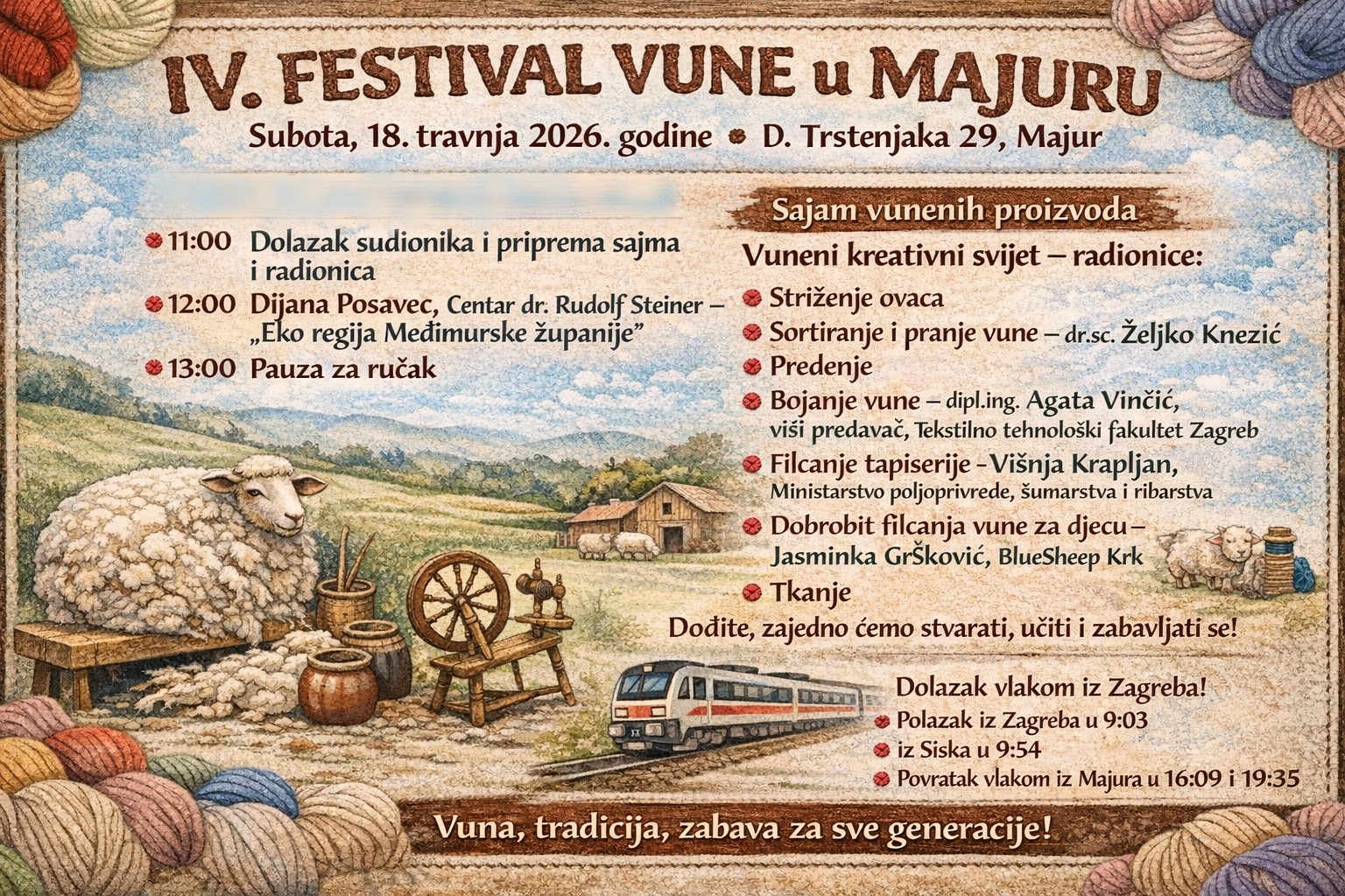Općina Majur u subotu 18.4.2026. od 11 sati organizira 4. Festival vune u Majuru, koji će se održati u Majuru, Davorina Trstenjaka 29.