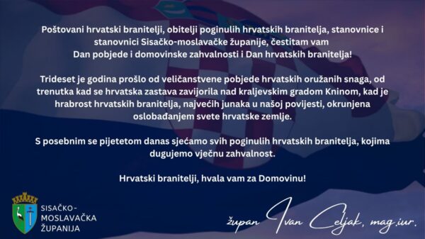 “Poštovani hrvatski branitelji, obitelji poginulih hrvatskih branitelja, stanovnice i stanovnici Sisačko-moslavačke županije, čestitam vam Dan pobjede i domovinske zahvalnosti i Dan hrvatskih branitelja! Trideset...